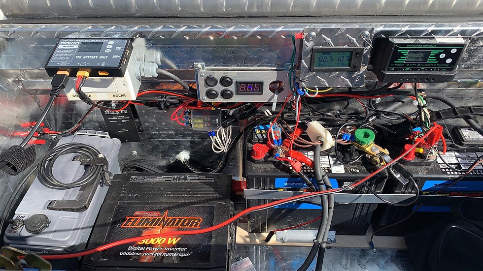 After..... LifePO4 battery with expansion plugs MPPT charge controller, bus bars all hidden under protective cover. Master battery switch and external solar charge plug to augment rooftop panel. 200 watts of solar and 150 Amp/Hr battery capacity (2 batteries 100 + 50) Monitoring of charging + drain (Bluetooth as well)